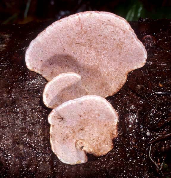 - SporocarpFruiting body annual or short-lived perennial, sessile, 4-10 cm broad, 1.5-2 cm thick, resupinate, forming a fan-shaped, slightly convex, thin bracket, several often sharing a common base; margin entire, undulate or lobed, the latter often the result of emerging new growth; surface at first matted-hairy, becoming smooth, bumpy or warted, sometimes concentrically furrowed, mahogany-brown to dark-brown, usually pinkish at the margin when fresh, nearly black towards the base; flesh thin, pliant, dingy pink when fresh, woody, and dingy pinkish-brown in age, blackening in KOH; odor and taste mild.
