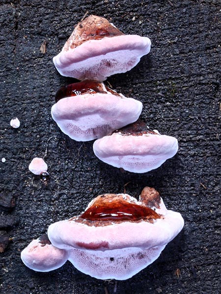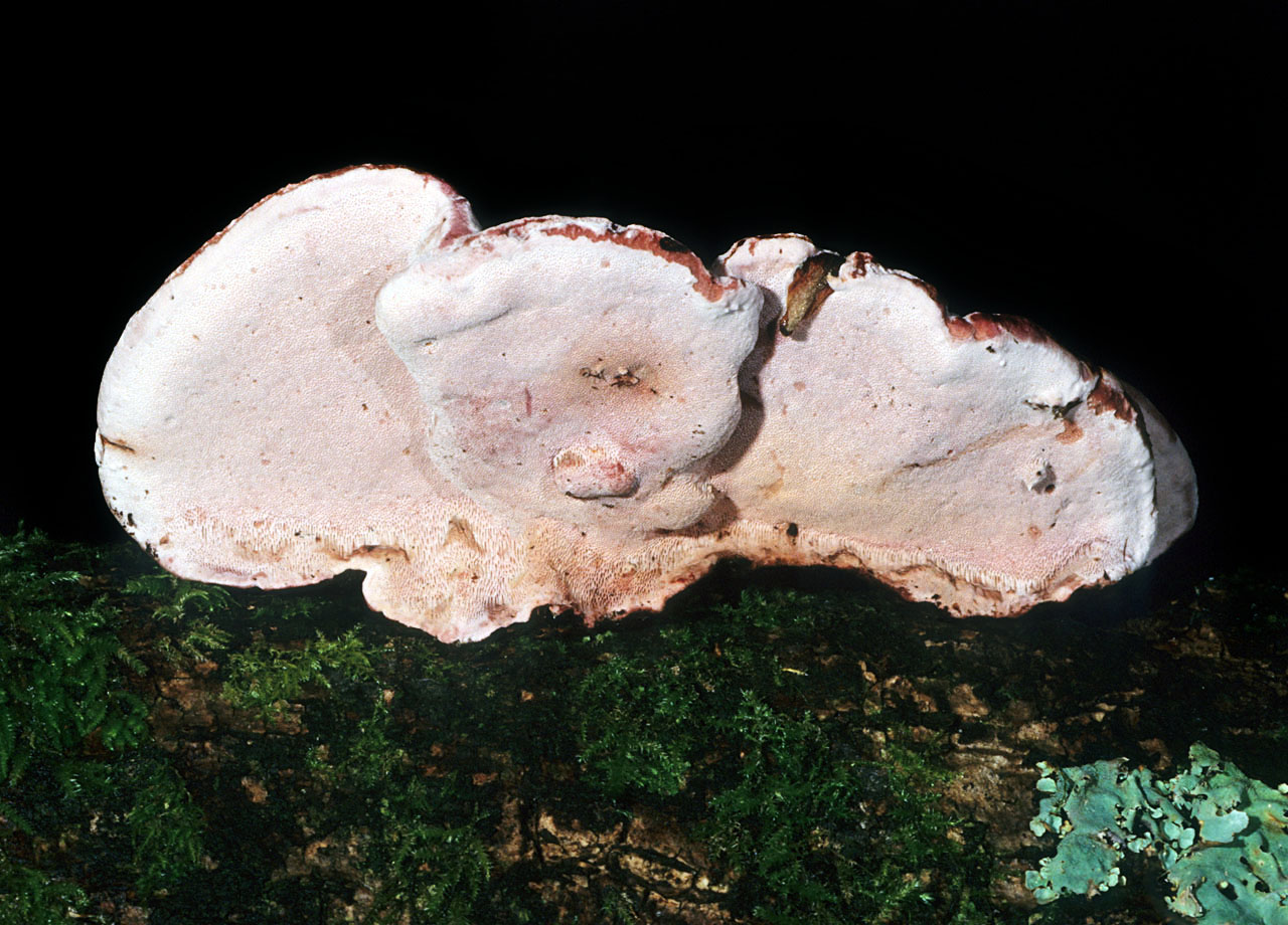 - CommentsThough not the most common of our local conks, Fomitopsis cajanderi is easily the prettiest. The mahogany-brown to almost black shelves of fresh Fomitopsis cajanderi with contrasting rose-pink margins and pores are a visual delight. In age the pink color becomes muted but specimens are still easily recognized.