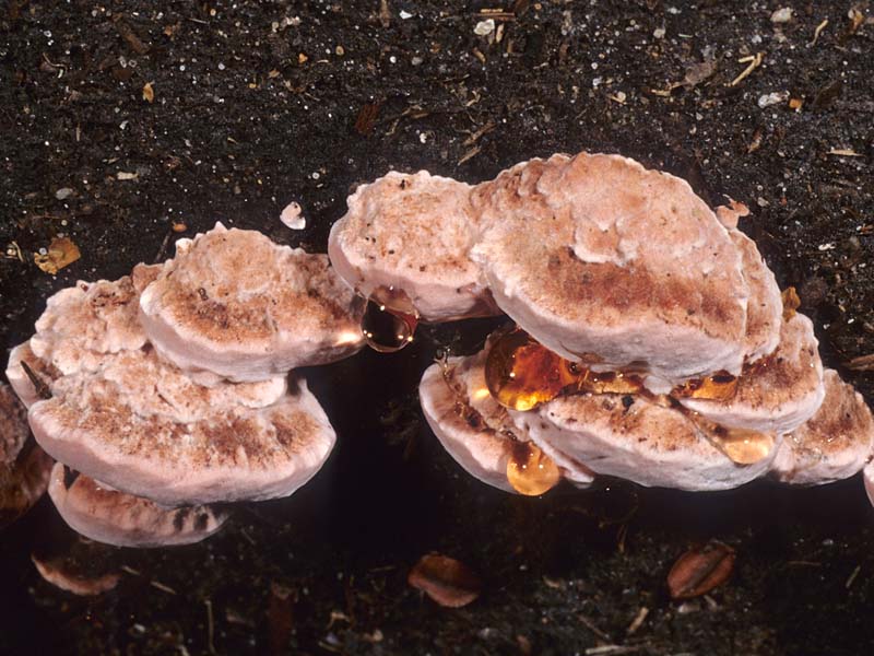 — young sporocarps exuding drops of liquid - Michael Wood: Fomitopsis cajanderi (CP) — young sporocarp exuding drops of liquid