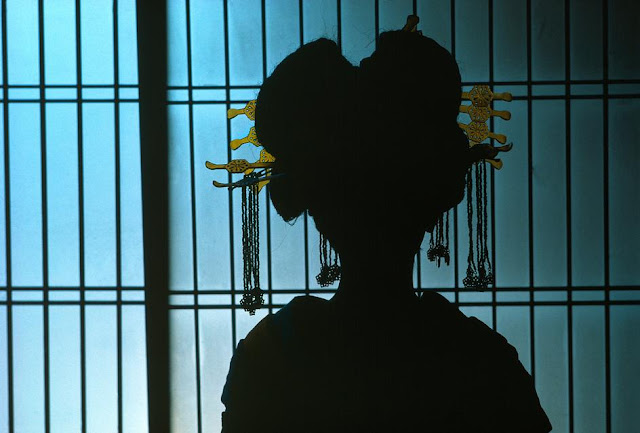 A Geisha in Sumiya geisha house in Shimbara area. The "Oiran" wears her traditional costume. 1977
